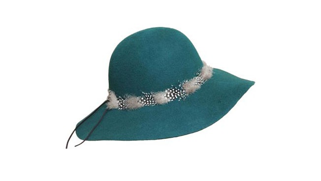 100%純羊毛的帽子,厚實(shí)的大檐羊毛帽,帽身圍繞一圈黑白相間的羽毛,別致而時(shí)尚。